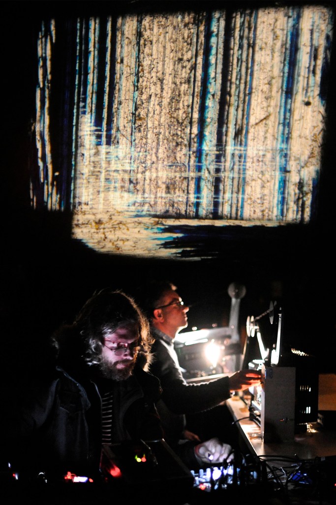 The visual development is echoed in the sonic sphere; contact mics amplify the projectors internal workings and the optical cracks and bursts are manipulated into a huge unfolding live synchronized score’.