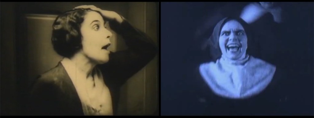 A short succession of splits-screens gathers women in the throes of extreme states, screaming, with eyes wide, arms thrown up in dismay, angular eyebrows, stunned mouths: instants of extreme emotions sought and found in silent films of the 1920s.