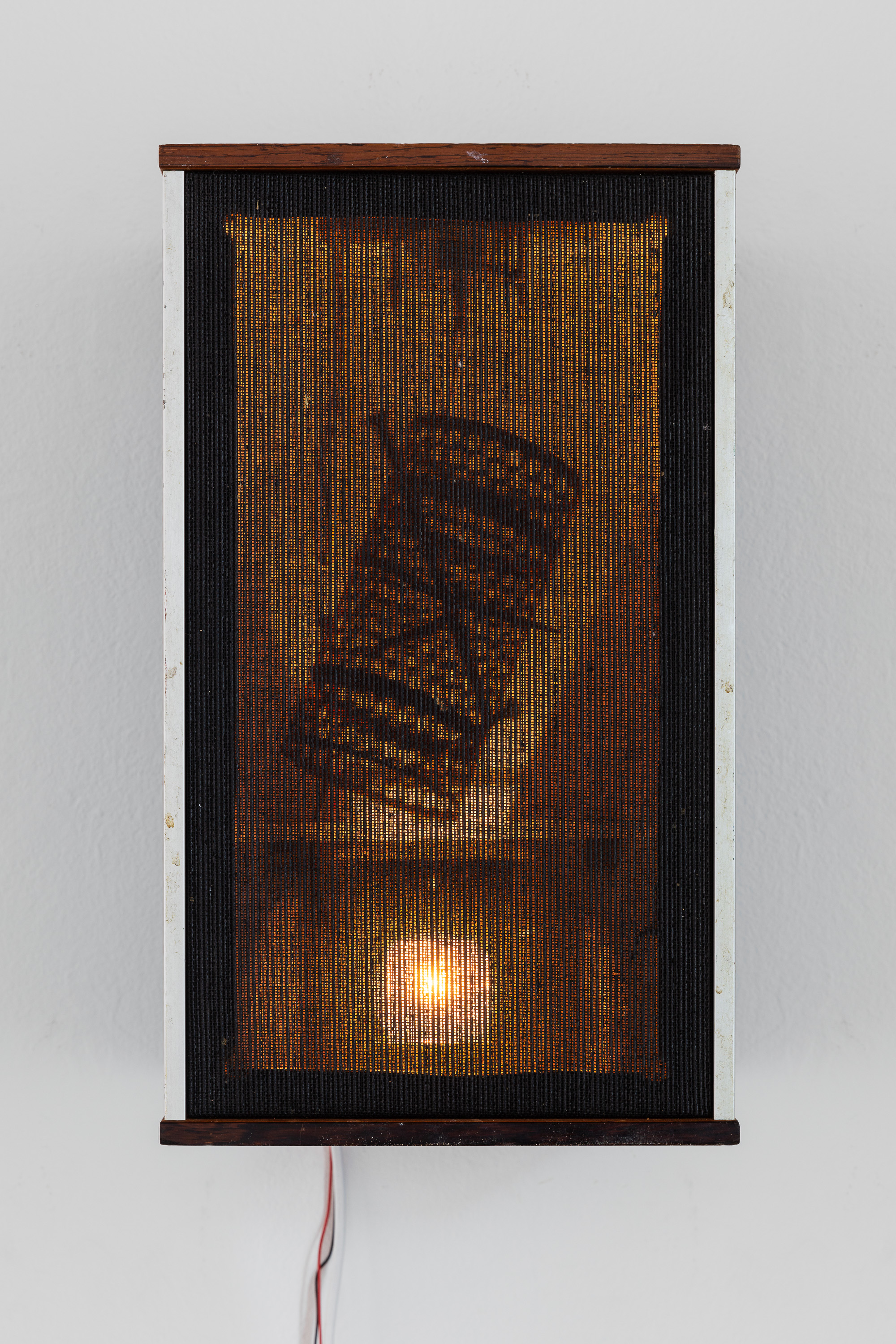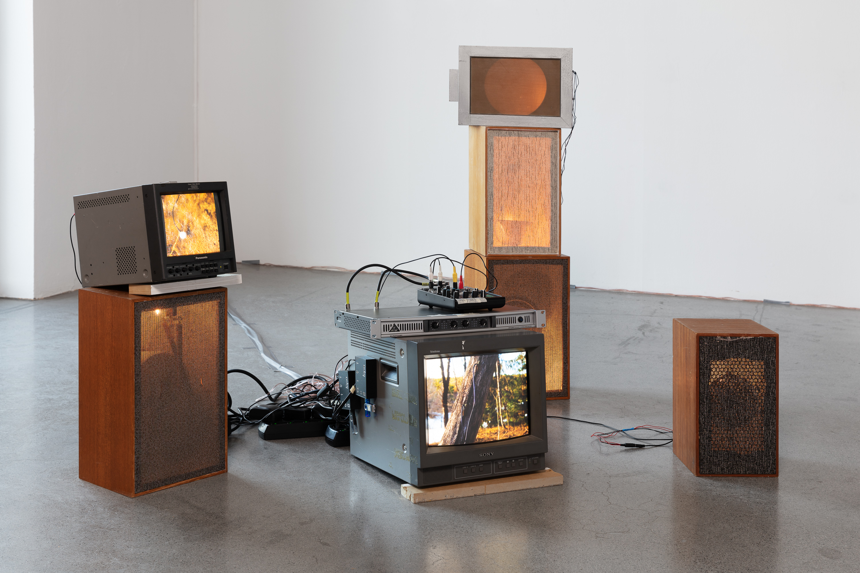 Re-purposed orphaned speakers, in wooden cabinets with a mesh screen front. The speaker cone is removed, small sculptural devices are installed, rotated with a very slow motor. These mechanisms, constructed from metal, wood, etc are illuminated with a small lamp and emit a cycle of repetitive sonics. The mesh front is reinserted, and the speakers are grouped alongside two monitors. The result is a babbling, subtly shifting sound piece which also becomes a shadow cinema. The back-lit silhouettes are cast onto the mesh screens in each of the speaker cabinets.